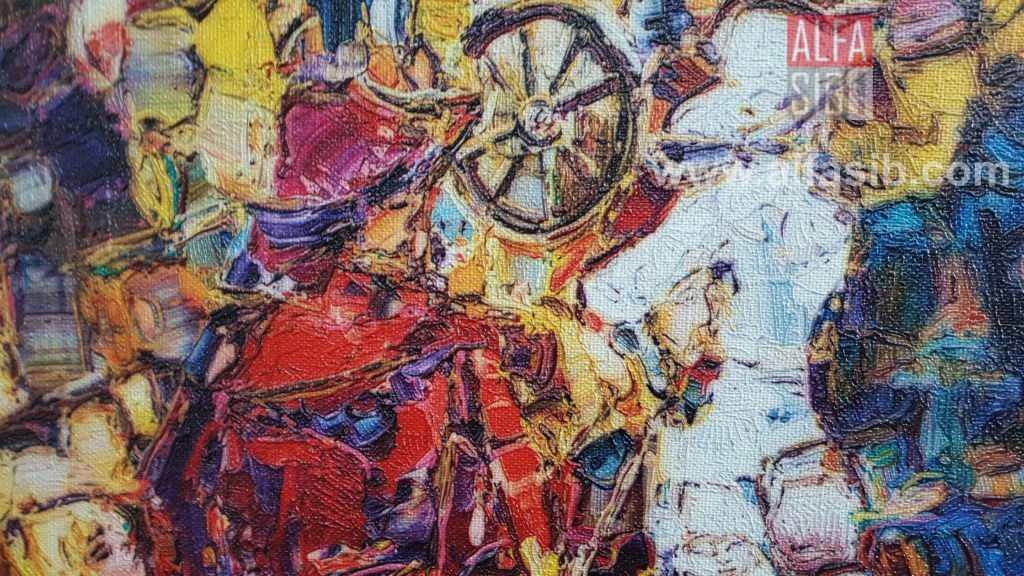 В Иркутске всегда было много хороших, талантливых художников. Они писали и пишут замечательные картины, которые выставляются в музеях и украшают частные коллекции. Но есть среди них один — кого ни с кем нельзя перепутать, потому что работы его абсолютно «иркутские». Не только по месту их написания, а по духу, стилю, настроению, может быть, даже запаху…. Их ни с чем не перепутаешь, в них влюбляешься с первого взгляда и навсегда. Это Александр Иванович Шелтунов. Человек удивительного дарования, невероятной харизмы и потрясающего чувства юмора. Копию одной из них — «Кафе «Снежинка» — наш заказчик захотел видеть в своем доме. Макет мы купили у наследников мастера, напечатали на холсте. Размеры у работы впечатляющие – почти два на два с половиной метра, да и исполнение замечательное – точная имитация масляных мазков и отличная цветопередача.
